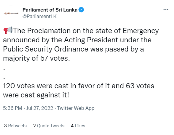 இதற்கமைவாக, அவசர கால சட்டம் 57 மேலதிக வாக்குகளால் நிறைவேற்றப்பட்டுள்ளதுடன் மேலும் ஒரு மாத காலத்திற்கு அவசரகாலச்சட்டம் அமுலில் இருக்கும் என்பது குறிப்பிடத்தக்கது.