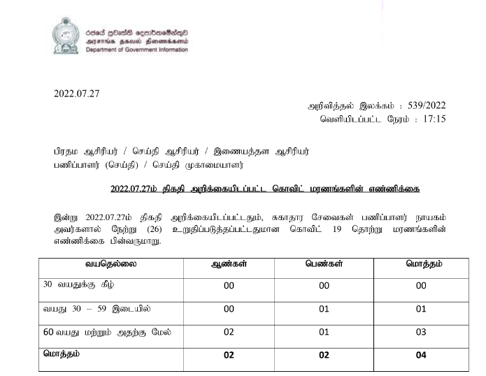 நாட்டில் நேற்று (27.07.2022) கொரோனா தொற்று காரணமாக மேலும் நான்கு பேர் உயிரிழந்துள்ளதாக அரசாஙக்க தகவல் திணைக்களம் தெரிவித்துள்ளது.