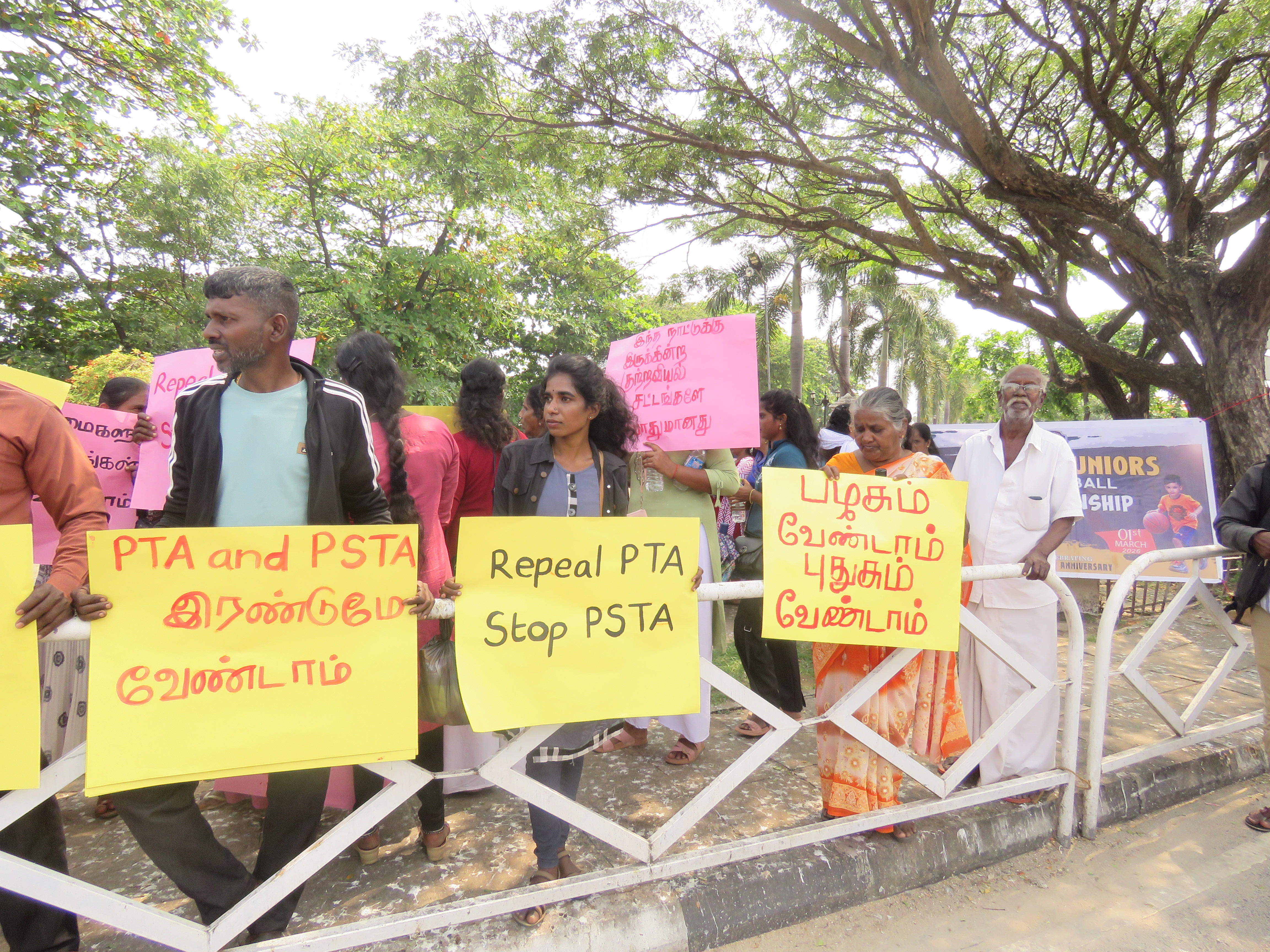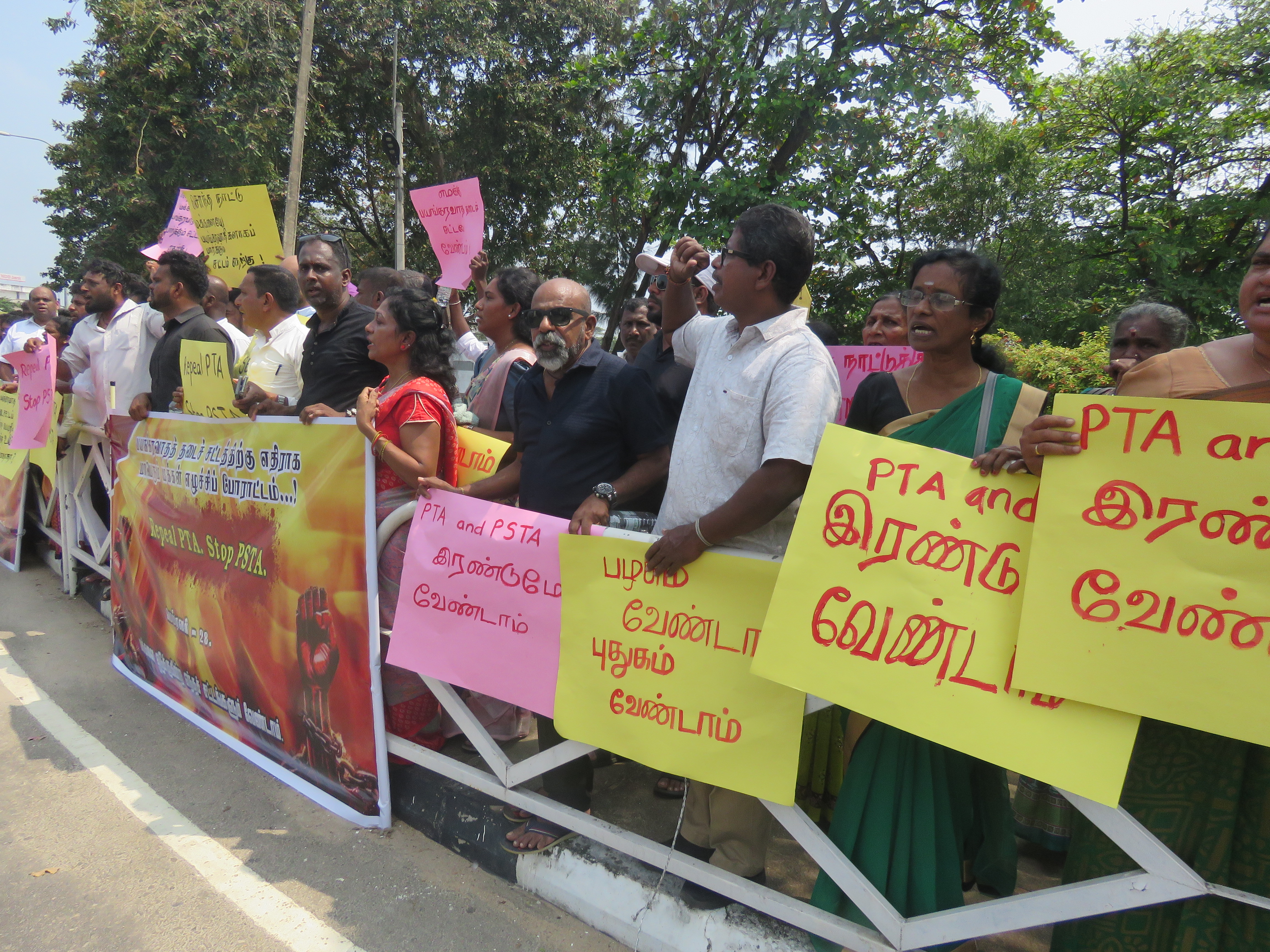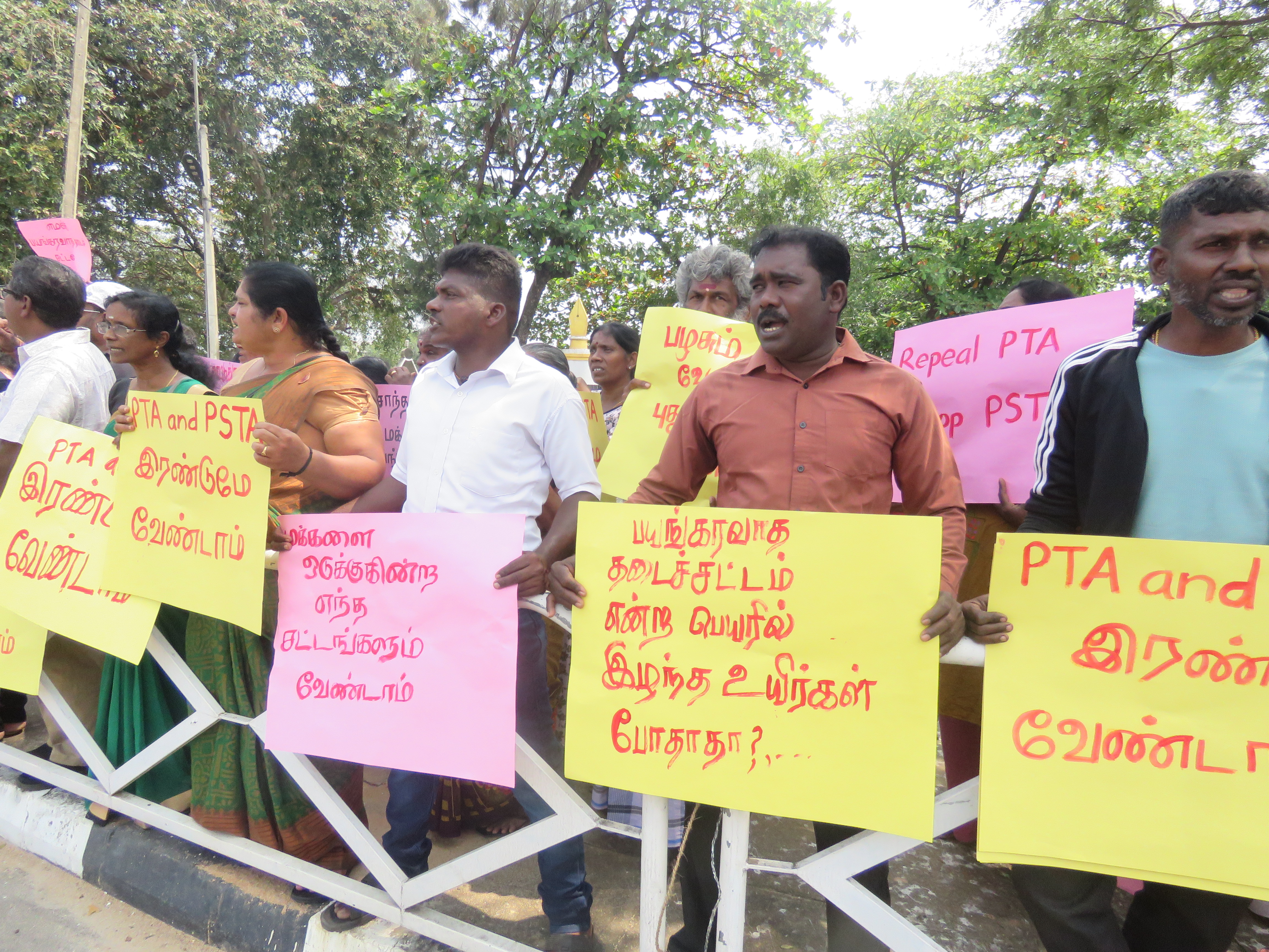 இதனையடுத்து பயங்கரவாத தடைச்சட்டமும் வேண்டாம், அரசை பாதுகாக்கும் புதிய சட்டம் வேண்டாம், இந்த நாட்டுக்குள் இருக்கும் குற்றவியல் சட்டம் போதும், பயங்கரவாத தடைச் சட்டம் என்ற பெயரில் இழந்த உயிர்கள் போதாதா? மக்களை ஒடுக்குகின்ற எந்த சட்டமும் வேண்டாம், சொந்த நாட்டு மக்களை பயங்கரவாதமாக பார்க்கும் சட்டம் எதற்கு, போன்ற சுலோகங்கள் ஏந்தியவாறு கோஷம் எழுப்பி அங்கிருந்து ஆர்ப்பாட்ட ஊர்வலம் ஆரம்பித்தது.