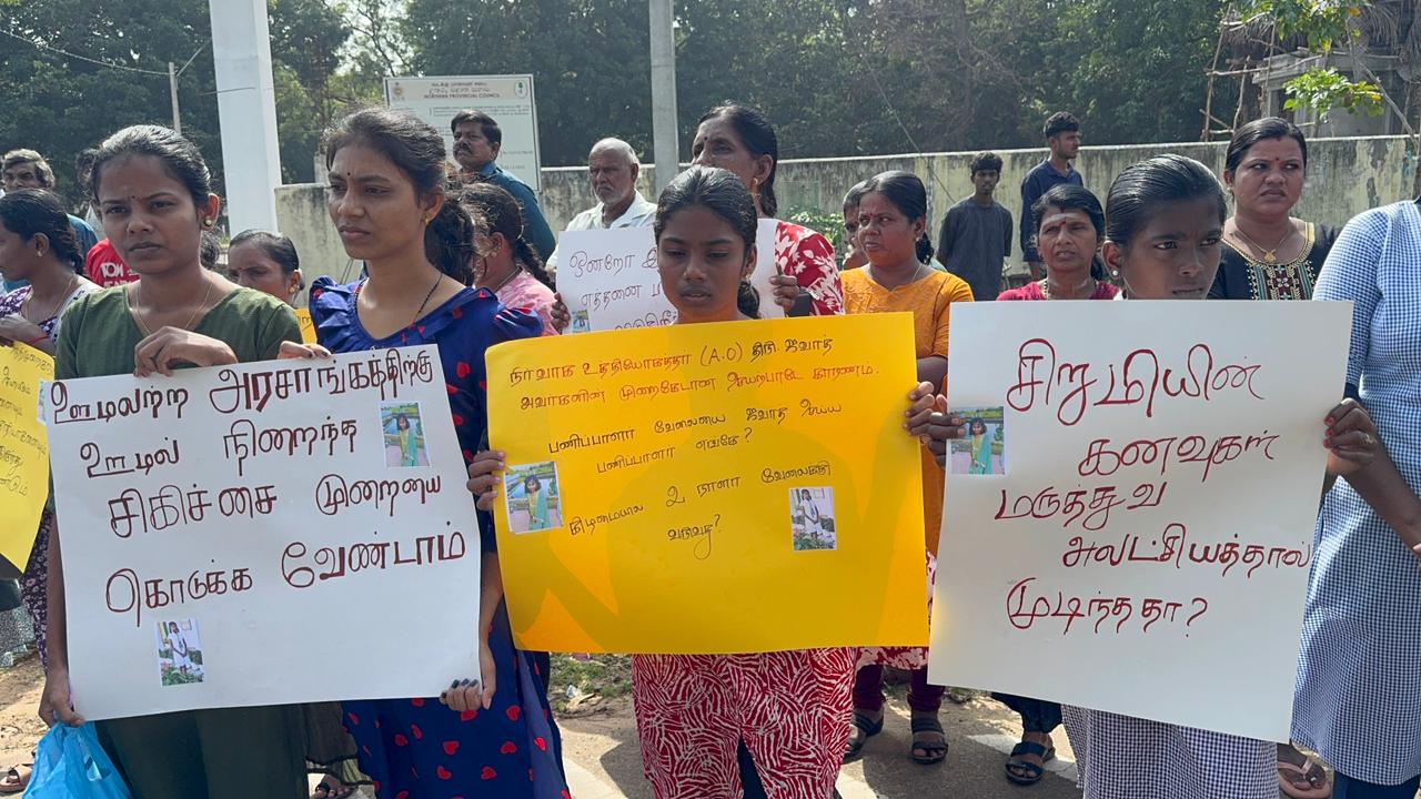 ஒன்றாக சந்தோசமாக வாழும் நாட்டில் முல்லைத்தீவு மாவட்ட வைத்தியசாலையில் இவ்வாறான சதிவேலைகளை செய்து ஏன் மக்களை ஏமாற்றுகின்றீர்கள்? ஒன்றோ இரண்டோ பிழைகளை விடுகின்றீர்கள்? ஏன் மக்களை ஏமாற்றுகின்றீர்கள்? நீதி பெறும் வரை எங்கள் குரல் ஓயாது?சிறுமியின் கனவுகள் மருத்துவ அலட்சியத்தால் முடிந்ததா?ஊழலற்ற அரசாங்கத்தில் ஊழல் நிறைந்த சிகிச்சை முறையை கொடுக்கவேண்டாம்?உயிரை காக்க வேண்டிய கைகள் உயிரை வாங்கலாமா? என்ற கோசங்கள் அடங்கிய பதாதைகளை தாங்கியபடி போராட்டத்தில் ஈடுபட்டிருந்தனர்.