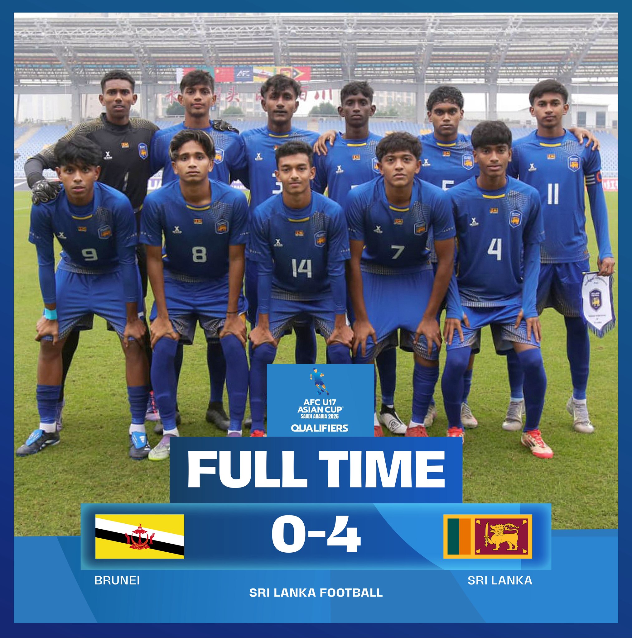 சீனா, சொங்குவிங் யொங்சுவான் ஸ்போர்ட்ஸ் சென்டர் விளையாட்டரங்கில் இன்று நடைபெற்ற 17 வயதுக்குட்ட ஆசிய கிண்ண ஏ குழு தகுகாண் கால்பந்தாட்டப் போட்டியில் புருணை தாருஸ்ஸலாம் இளையோர் அணியை 4 0 என்ற கோல்கள் வித்தியாசத்தில் இலங்கை இளையோர் அணி இலகுவாக வெற்றிகொண்டது.