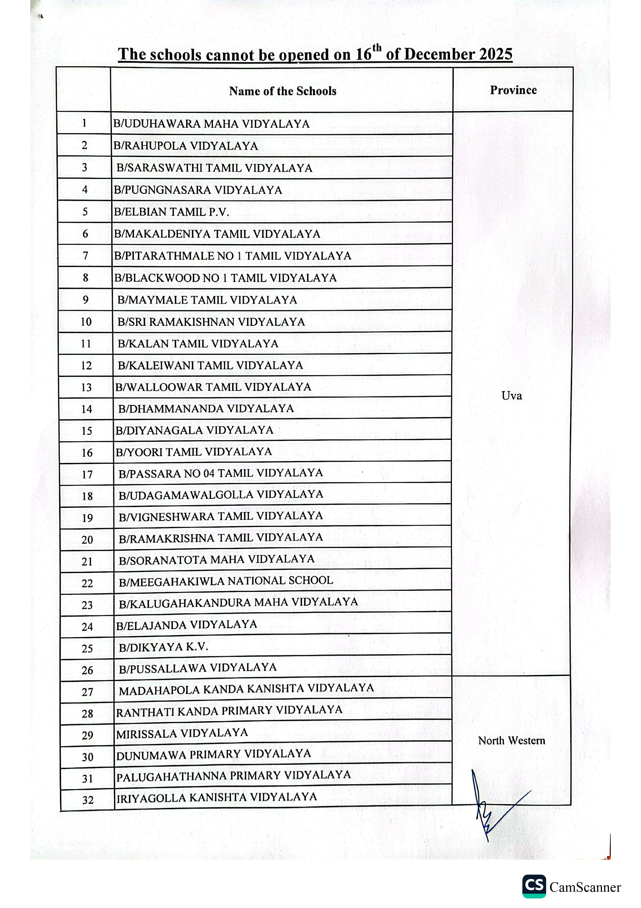 • கல்வி அமைச்சினால் பெயர் குறிப்பிடப்பட்டுள்ள பாடசாலைகளைத் தவிர, ஏனைய அனைத்து பாடசாலை மாணவர்களுக்கும் பாடசாலை ஆரம்பம் 2025 டிசம்பர் 16 ஆம் திகதி.