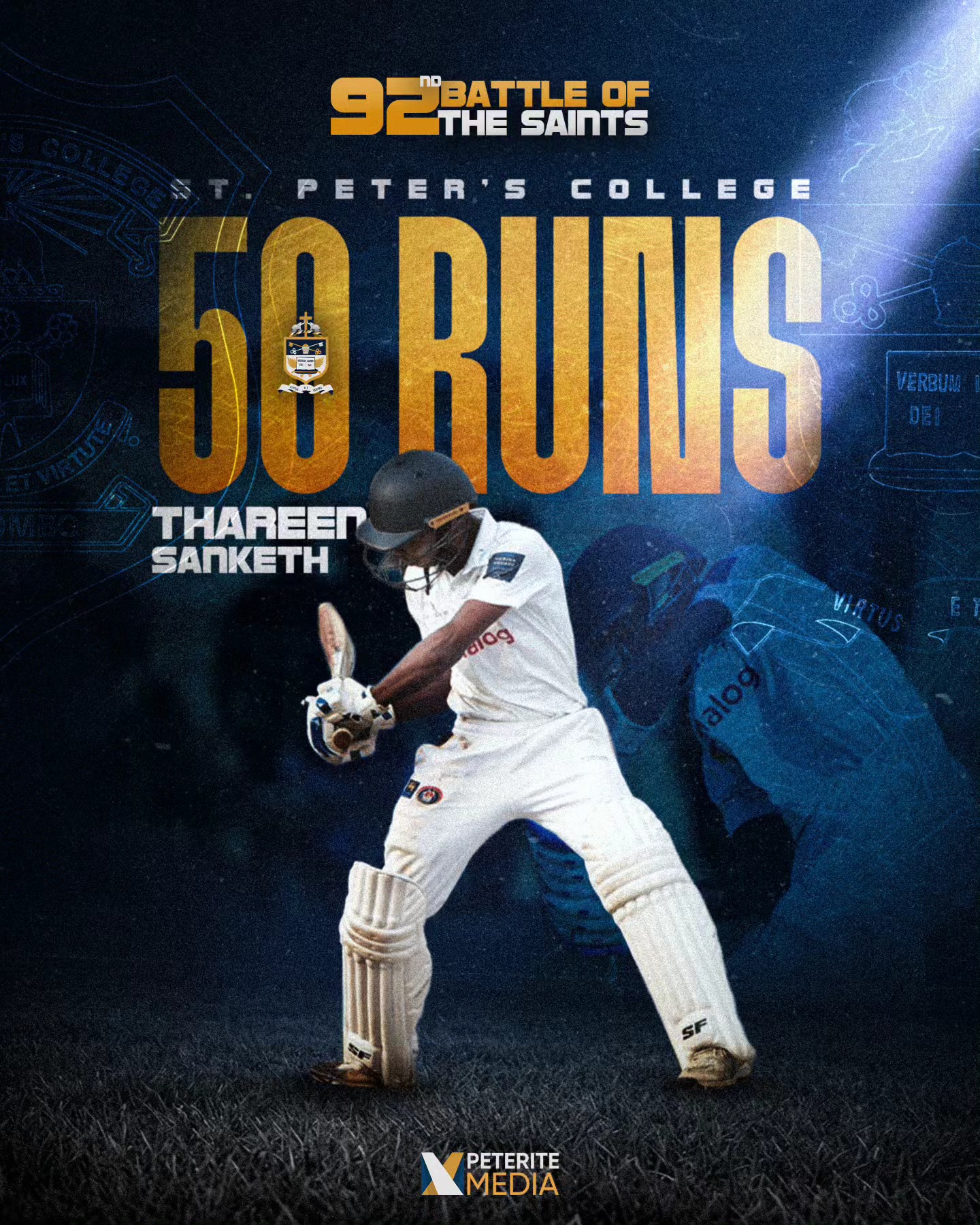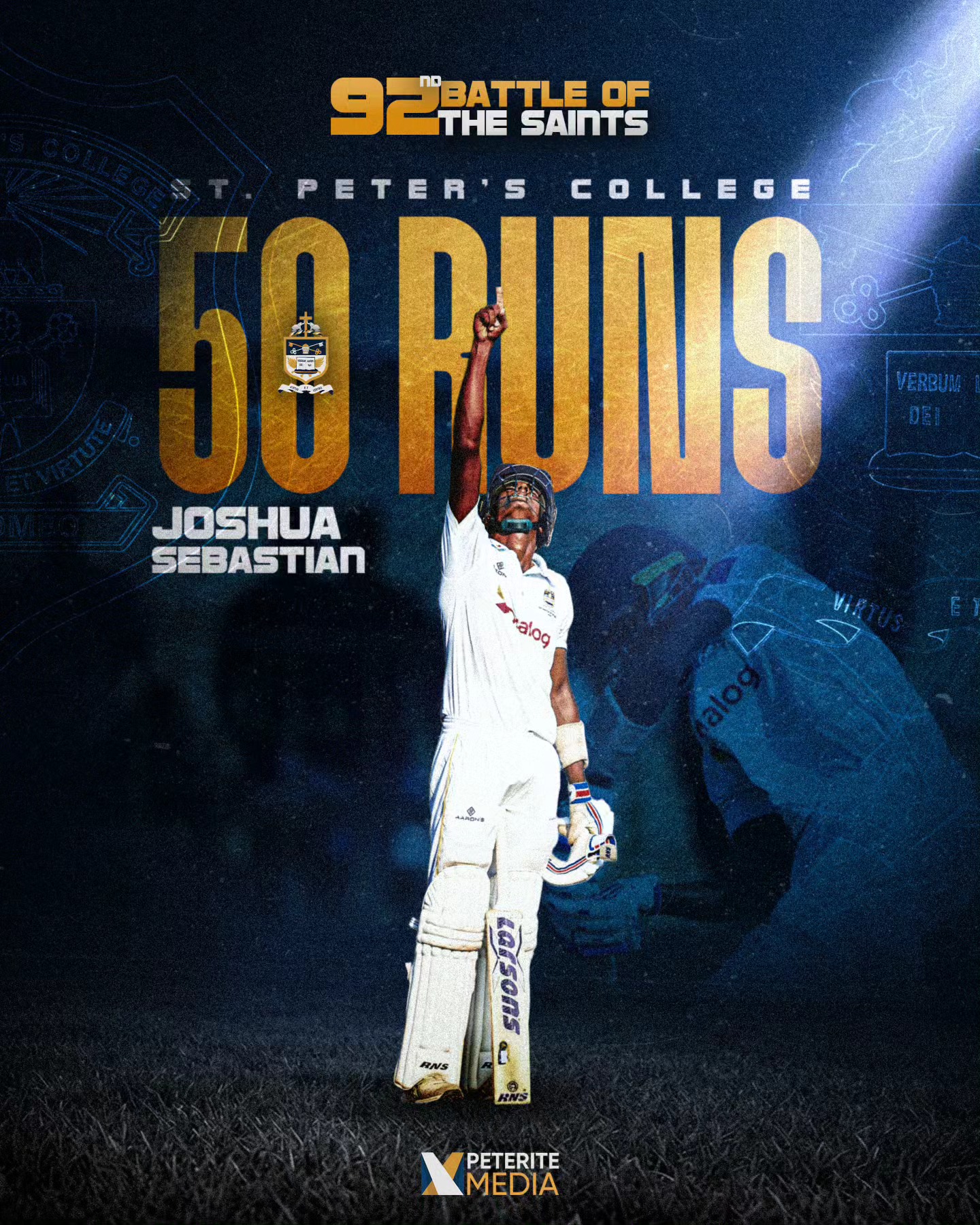 ஆனால், 7ஆம் இலக்க வீரர் ஜொஷுவா செபஸ்டியன், 9ஆம் இலக்க வீரர் தரீன் சன்கேத் ஆகிய இருவரும் பொறுமையுடனும் துணிச்சலுடனும் துடுப்பெடுத்தாடி அரைச் சதங்கள் குவித்ததுடன் 8ஆவது விக்கெட்டில் 61 ஓட்டங்களைப் பகிர்ந்து புனித பேதுருவானவர் அணி தோல்வி அடைவதைத் தவிர்க்க உதவினர்.